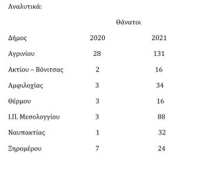 Σύμφωνα με το σχετικό πίνακα τους περισσότερους θανάτους από κορωνοϊό το 2021 καταγράφει ο Δήμος Αθηναίων με 1.153, ακολουθεί η Νίκαια με 698, η Θεσσαλονίκη με 686, Εύοσμος 512, Λάρισα με 356, Πάτρα 331. Σε ό,τι αφορά στους Δήμους της Αιτωλοακαρνανίας οι περισσότεροι θάνατοι από covid καταγράφονται στον Δήμο Αγρινίου και ακολουθεί ο Δήμος Μεσολογγίου.