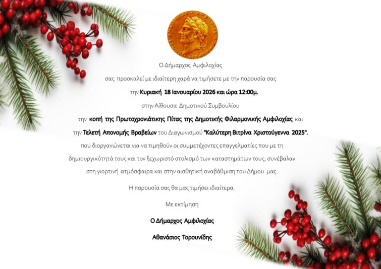 Την Κυριακή 18 Ιανουαρίου η Τελετή Απονομής Βραβείων του διαγωνισμού “Καλύτερη βιτρίνα Χριστούγεννα 2025” και η κοπή πρωτοχρονιάτικης πίτας της Δημοτικής Φιλαρμονικής Αμφιλοχίας