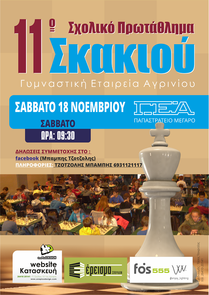 Το σκακιστικό τμήμα της Γυμναστικής Εταιρείας Αγρινίου διοργανώνει το Σάββατο 18 Νοεμβρίου 2023 στις 09.30 π.μ. στο Παπαστράτειο Μέγαρο το 11ο Σχολικό Πρωτάθλημα σκακιού. Στη διοργάνωση θα λάβουν μέρος μαθητές από τα νηπιαγωγεία, δημοτικά, γυμνάσια και λύκεια του Αγρινίου και της ευρύτερης περιοχής.