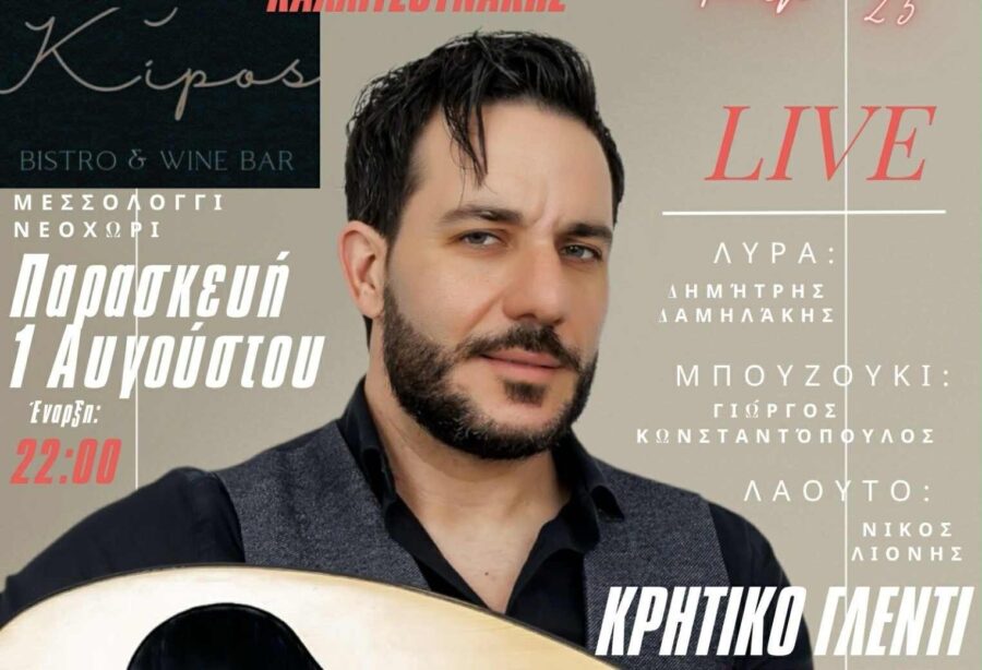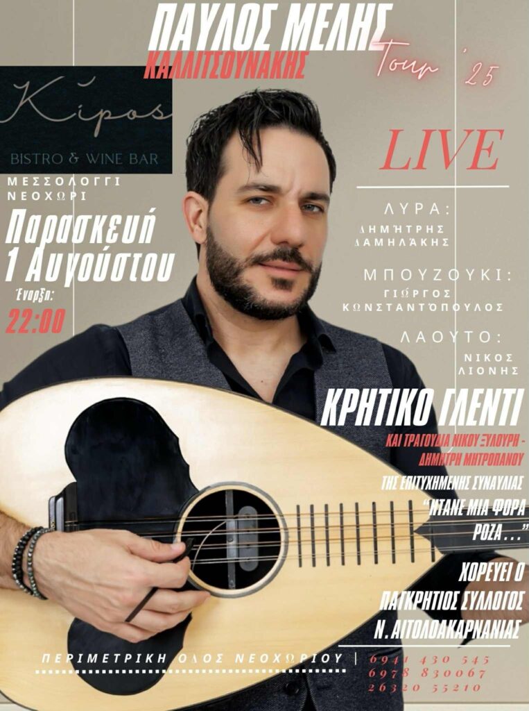 Υπόσχεται μια αξέχαστη βραδιά στον όμορφο κήπο του με τους μοναδικούς Παύλο Μελά και τον Παγκρήτιο σύλλογο Αιτωλ/νίας Οι δύο τους ενώνουν τις δυνάμεις τους και υπόσχονται ένα γλέντι γεμάτο μουσική, χορό και… άφθονο κέφι!
