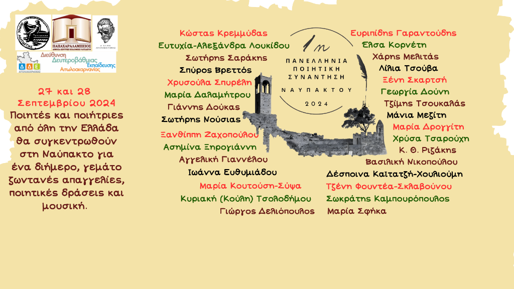 Παπαχαραλάμπειος Αίθουσα: Στην Κεντρική εκδήλωση της συνάντησης οι προσκεκλημένοι/ες ποιητές και ποιήτριες θα γνωριστούν με το κοινό της Ναυπάκτου, απαγγέλλοντας επιλεγμένα ποιήματά τους με μουσικές αντιστίξεις από τη μουσικό Κυριακή (Κούλη) Τσολοδήμου.