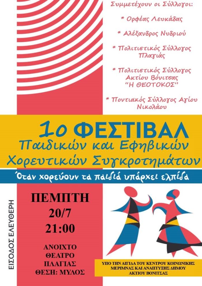 Το 1ο Φεστιβάλ Παιδικών – Εφηβικών Χορευτικών Τμημάτων που διοργανώνει το Κέντρο Κοινωνικής Μέριμνας και Ανάπτυξης του Δήμου Ακτίου Βόνιτσας, η Τοπική Κοινότητα Πλαγιάς και εθελοντική ομάδα γυναικών της Πλαγιάς , θα πραγματοποιηθεί με είσοδο ελεύθερη την Πέμπτη 20 Ιουλίου 2023 στις 21.00 στο Ανοιχτό Θέατρο Πλαγιάς . Παράλληλα θα γίνουν και ο Αγιασμός – Εγκαίνια του Ανοιχτού Θεάτρου Πλαγιάς που όπως αναφέραμε ανακαινίσθηκε για να καλύπτει τις ανάγκες μεγάλων πολιτιστικών εκδηλώσεων και θεατρικών παραστάσεων και για να είναι ένας χώρος συνάντησης