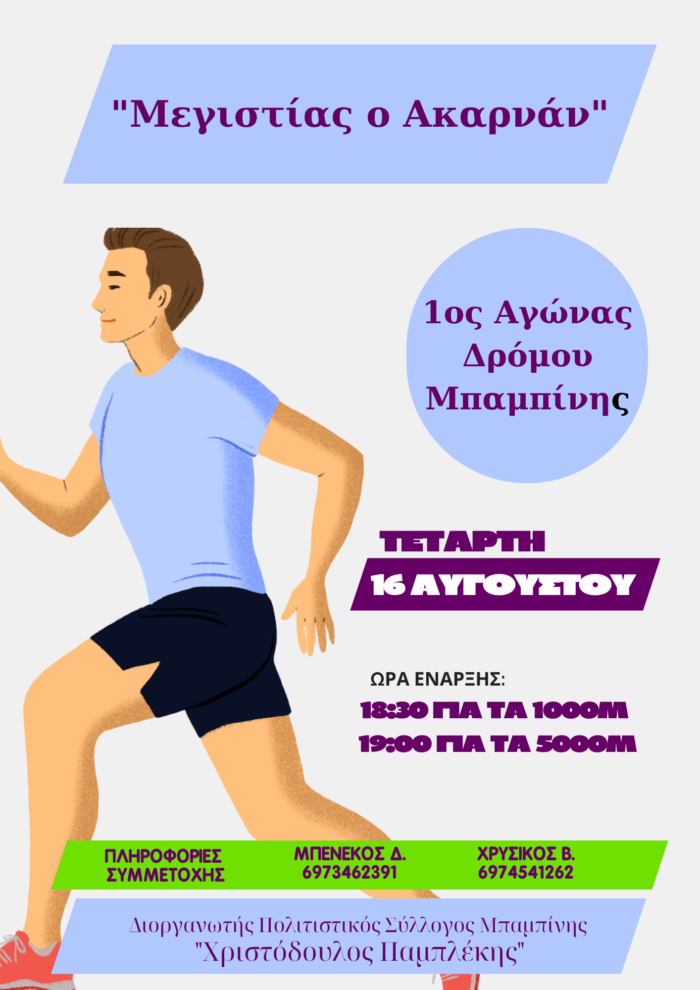 Ο Πολιτιστικός Σύλλογος Μπαμπίνης “Χριστόδουλος Παμπλέκης”, διοργανώνει στις 16/08/2023, ημέρα Τετάρτη, τον 1ο Αγώνα Δρόμου «Μεγιστίας ο Ακαρνάν» στην Μπαμπίνη του Δήμου Ξηρομέρου.