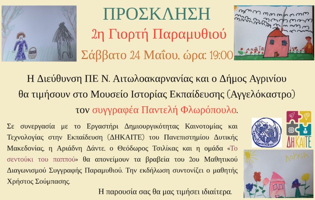 Το Μουσείο Ιστορίας Εκπαίδευσης Π.Ε. Αιτωλοακαρνανίας και «Το σεντούκι του παππού» προσκαλούν στη 2η Γιορτή Παραμυθιού και την Απονομή Μαθητικών Βραβείων Σάββατο 24 Μαΐου 2025 ΩΡΑ 19:00 στο Αγγελόκαστρο.