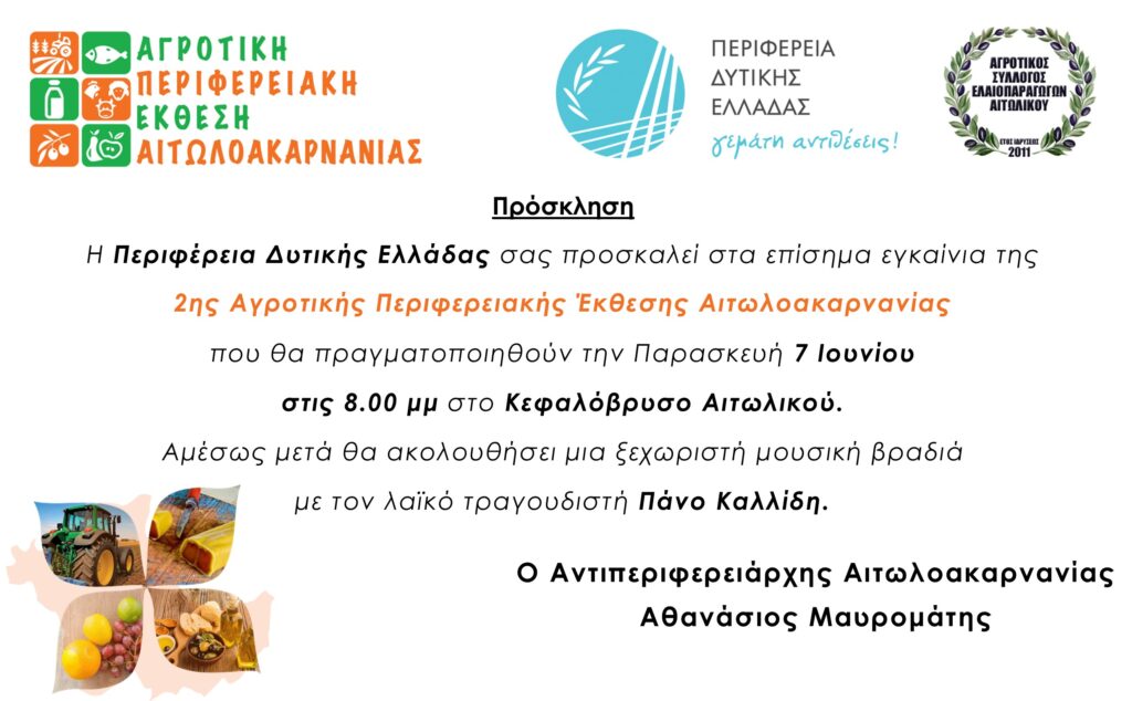 Η μεγάλη Αγροτική Περιφερειακή Έκθεση Αιτωλοακαρνανίας θα πραγματοποιηθεί για δεύτερη φορά στις 7, 8 και 9 Ιουνίου 2024 στο Κεφαλόβρυσο Αιτωλικού.