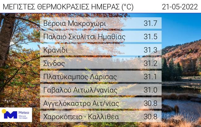 Άνοδο σημείωσε η θερμοκρασία το Σάββατο 21 Μαΐου σύμφωνα με το δίκτυο αυτόματων μετεωρολογικών σταθμών του Εθνικού Αστεροσκοπείου Αθηνών / meteo.gr, με τον υδράργυρο να πλησιάζει τοπικά στους 32 βαθμούς Κελσίου. Η υψηλότερη μέγιστη καταγράφηκε στο Μακροχώρι Ημαθίας με 31,7 °C. Στον πίνακα που ακολουθεί παρουσιάζονται οι 8 σταθμοί που κατέγραψαν τις υψηλότερες μέγιστες θερμοκρασίες της ημέρας.