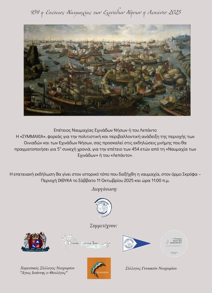 Ο πολιτιστικός φορέας «ΣΥΜΜΑΧΙΑ» που συμβάλλει με το έργο του στην πολιτιστική και περιβαλλοντική ανάδειξη της περιοχής των Οινιαδών και των νήσων Εχινάδων, διοργανώνει για 5η συνεχή φορά τις εκδηλώσεις μνήμης για την 454η επέτειο από την ιστορική ναυμαχία των Εχινάδων ή «Λεπάντο».