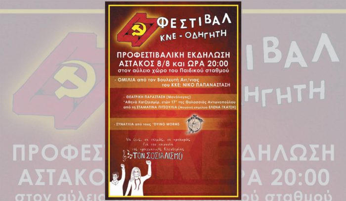 Με αυτές τις «παραινέσεις», προετοιμάζεται και η εκδήλωση του 47ου Φεστιβάλ της ΚΝΕ και του «Οδηγητή», στον Αστακό, που θα πραγματοποιηθεί την Κυριακή 8 Αυγούστου, στις 20:00, στον αύλειο χώρο του Παιδικού Σταθμού.