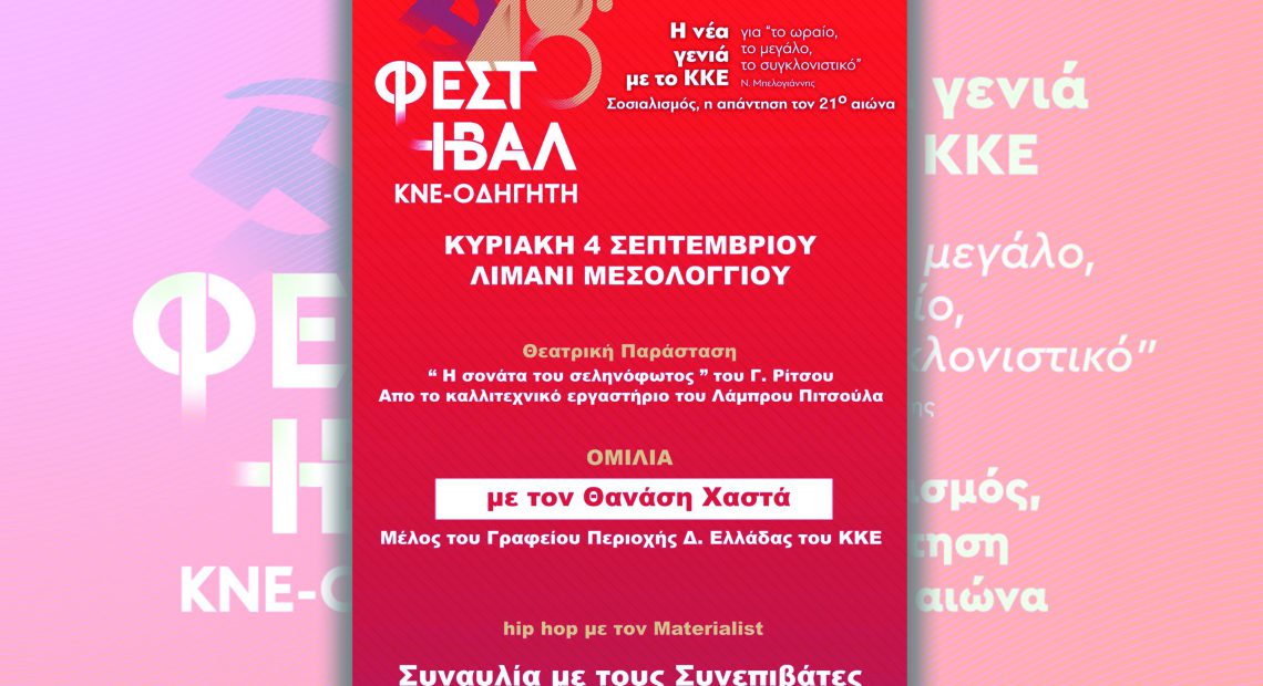 Συνεχίζει το «ταξίδι» του στην Αιτωλοακαρνανία το 48ο Φεστιβάλ ΚΝΕ – Οδηγητή που με κεντρικό σύνθημα «Η νέα γενιά με το ΚΚΕ, για το ωραίο, το μεγάλο, το συγκλονιστικό – Σοσιαλισμός η απάντηση στον 21ο αιώνα», θα κάνει «στάση» στο λιμάνι του Μεσολογγίου την Κυριακή 4 Σεπτέμβρη, με τις εκδηλώσεις να ξεκινούν στις 8:30μ.μ.