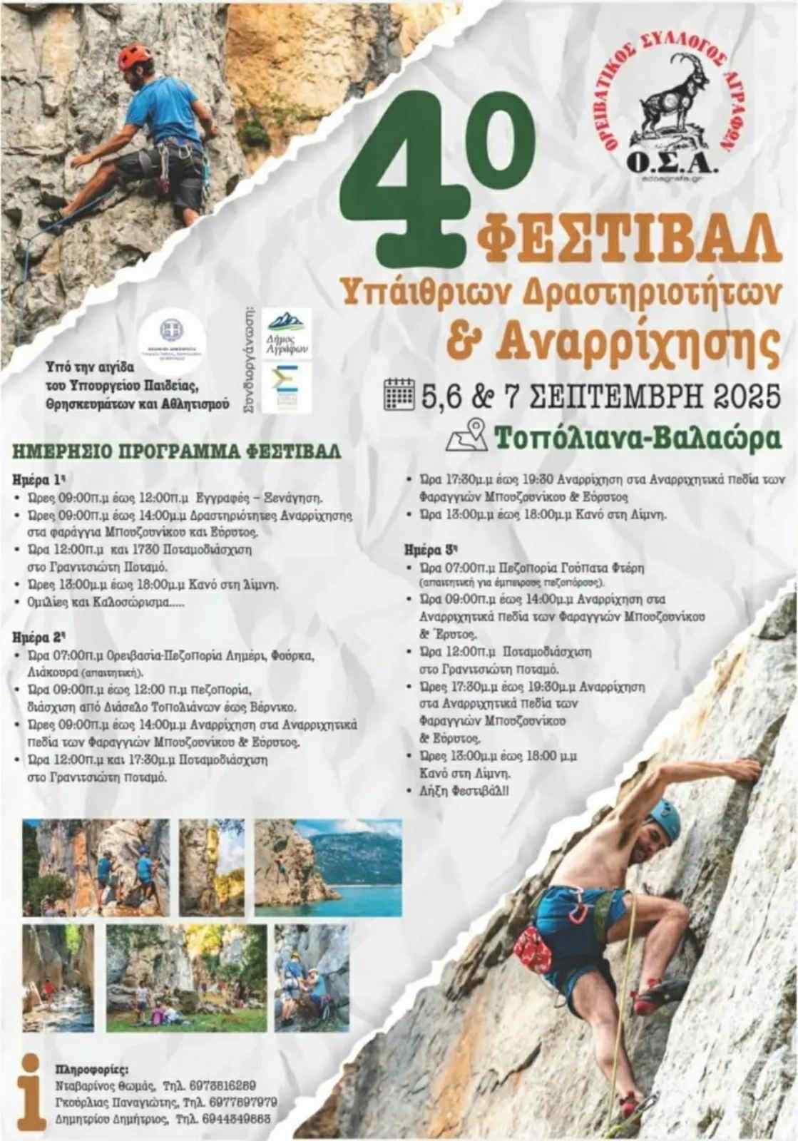 Ο Ορειβατικός Σύλλογος Αγράφων σας προσκαλεί στο 4ο Φεστιβάλ Αναρρίχησης στα Τοπόλιανα, που φέτος θα πραγματοποιηθεί από τις 5 έως τις 7 Σεπτεμβρίου. Μια τριήμερη γιορτή για την αναρρίχηση, τη φύση και την περιπέτεια, σε έναν τόπο που πραγματικά κόβει την ανάσα.