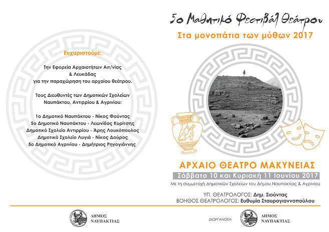Ο Δήμος Ναυπακτίας διοργανώνει το Φεστιβάλ Μαθητικού Θεάτρου: «Στα μονοπάτια των μύθων» 2017, στο αρχαίο θέατρο της Μακύνειας, το Σάββατο 10/6/2017 και την Κυριακή 11/6/2017 και ώρα 19:00. Το φεστιβάλ πραγματοποιείται με τη συνεργασία των διευθυντών και των εκπαιδευτικών των δημοτικών σχολείων που συμμετέχουν και την αρωγή της Εφορείας Αρχαιοτήτων & Λευκάδας. Ο θεσμός αυτός δεν έχει διαγωνιστικό χαρακτήρα αλλά στοχεύει στη βιωματική επαφή των μαθητών με το αρχαίο δράμα και με τον πλούτο της πολιτιστική μας κληρονομιάς.