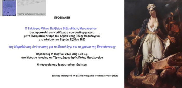 Σε έναν χώρο με συμβολική σημασία για την πόλη του Μεσολογγίου, στο ιστορικό παλαιό Δημαρχείο, νυν Μουσείο Ιστορίας και Τέχνης Δήμου Ιερής Πόλης Μεσολογγίου, όπου φυλάσσεται η «Εικόνα» της Εξόδου, θα διεξαχθεί ο 5ος Μαραθώνιος Ανάγνωσης για το Μεσολόγγι και τα χρόνια της Επανάστασης, που συνδιοργανώνει ο Σύλλογος Φίλων Βαλβείου Βιβλιοθήκης με το Πνευματικό Κέντρο Δήμου Ι. Π. Μεσολογγίου, την Παρασκευή 31 Μαρτίου 2023, στις 9.30 μ.μ., στο πλαίσιο των Εορτών για την 197η επέτειο της Εξόδου των Ελεύθερων Πολιορκημένων.