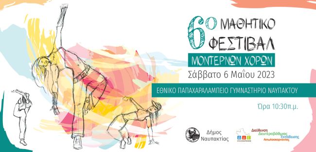 Ο Δήμος Ναυπακτίας και η Διεύθυνση Δευτεροβάθμιας Εκπαίδευσης Αιτωλοακαρνανίας διοργανώνουν αυτό το Σάββατο, 6 Μαΐου 2023 στο Κλειστό του Παπαχαραλαμπείου Σταδίου Ναυπάκτου το 6ο Μαθητικό Φεστιβάλ Μοντέρνων Χορών. Ώρα Έναρξης: 10:30’