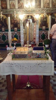 Οι εικόνες των Αγίων, δε, βρέθηκαν από τον Μπάρμπα-Χαράλαμπο, φύλακα του μοναστηριού,που ήταν κυνηγός και είδε σε όραμα μια μαυροντυμένη εκδοχή της Παναγίας να του υποδεικνύει το μέρος όπου θα έβρισκε τα λείψανα. Αυτό έγινε με μεγάλη λεπτομέρεια στο σημείο που θα άκουγε ένα χτύπο από το αυτοκίνητο με το οποίο θα πήγαινε για κυνήγι την επόμενη! Κάτι που συνέβη και το παρατήρησε μόνο ο ίδιος, ανακαλώντας το όραμα που είχε δει, για να βρει, αφού έσκαψε, αρχικά ένα μικρό μεταλλικό κάλυμμα κάτω από ένα άλλο ξύλινο και στη συνέχεια το θησαυρό της Μονής.