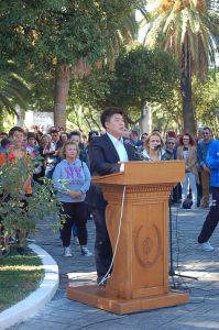 Στην ομιλία του ο Δήμαρχος Ιερής Πόλης Μεσολογγίου, ανέφερε πως «Σε καιρούς όπου η ανθρωπότητα ταράσσεται συχνά από τις άναρθρες κραυγές του πολέμου, ο Πολιτισμός και ο Αθλητισμός αποτελούν ευκαιρία επιστροφής του νου σε αρχέγονες δημιουργικές ανθρώπινες αξίες, όπως η Ειρήνη, η ευγενική άμιλλα, ο σεβασμός και ο έντιμος συν-αγωνισμός.