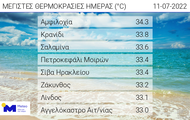 Υψηλές θερμοκρασίες σημειώθηκαν χθες στη Δυτική Ελλάδα και κυρίως στην Αιτωλοακαρνανία, όπου τα πρωτεία κατέκτησε η Αμφιλοχία με 34,3 βαθμούς, ενώ και το Αγγελόκαστρο Αιτωλοακαρνανίας, αλλά και η Ζάκυνθος ήταν μέσα στις 10 περιοχές με τις μέγιστες θερμοκρασίες σε ολόκληρη τη χώρα.