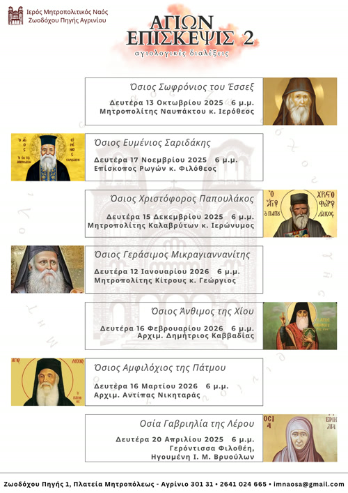 Για δεύτερη χρονιά θα πραγματοποιηθεί στον Ιερό Μητροπολιτικό Ναό Ζωοδόχου Πηγής Αγρινίου η σειρά των μηνιαίων Αγιολογικών Διαλέξεων, με γενικό τίτλο «Αγίων Επίσκεψις 2» αφιερωμένες σε νεοφανείς Αγίους της εποχής μας.