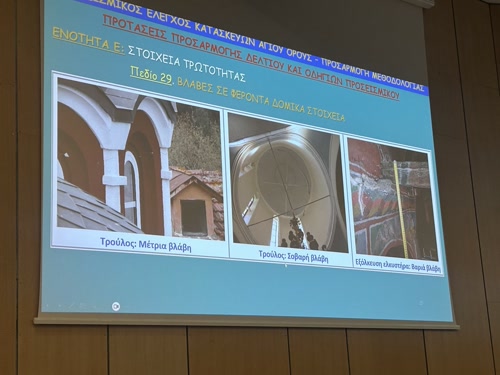 Οι ζημιές που καταγράφηκαν μετά τις αυτοψίες στις Μονές έπειτα από τη σεισμική ακολουθία των τελευταίων μηνών στο Άγιος Όρος, και ο σχεδιασμός για την αποκατάστασή τους, όσο και και για την περαιτέρω αντισεισμική θωράκιση των κτιρίων παρουσιάστηκε σε ημερίδα που διοργάνωσε το Τμήμα Κεντρικής Μακεδονίας του ΤΕΕ. Συγκεκριμένα παρουσιάστηκε το έργο Ομάδας Εργασίας, που έχει συσταθεί από το ΤΕΕ/ΤΚΜ, σε συνεργασία με το Τμήμα Πολιτικών Μηχανικών της Πολυτεχνικής Σχολής του Α.Π.Θ., τον ΟΑΣΠ – ΙΤΣΑΚ και το Κέντρο Διαφυλάξεως Αγιορείτικης Κληρονομιάς (Κε.Δ.Α.Κ), για τη διερεύνηση των σεισμικών δράσεων στο Άγιο Όρος και των επιπτώσεων στις μνημειακές κατασκευές.