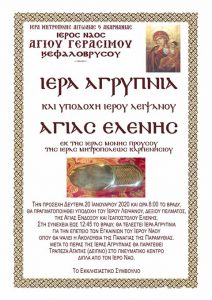 Την προσεχή Δευτέρα 20 Ιανουαρίου 2020 και ώρα 8:00 το βράδυ θα πραγματοποιηθεί υποδοχή του Ιερού Λειψάνου, δεξιού πνεύματος, Αγίας Ενδόξου και Ισαποστόλου Ελένης.