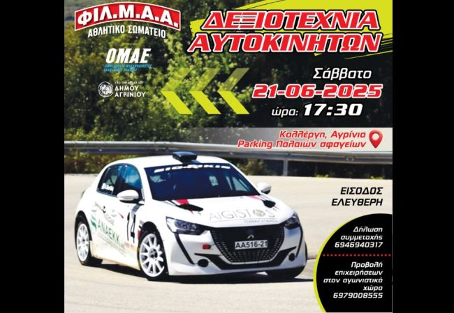 Το Αγωνιστικό Σωματείο ΦΙΛ.Μ.Α.Αγρινίου (@fil.m.a.a) διοργανώνει το Σάββατο 21 Ιουνίου στις 17:30 αγώνα Δεξιοτεχνίας στο Parking των Παλαιών Σφαγείων. Η είσοδος είναι ελεύθερη για τους θεατές.