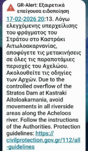 Εστάλη και ήχησε μάλιστα και μήνυμα της Πολιτικής Προστασίας στην Αιτωλοακαρνανία με το οποίο καλούνται οι πολίτες να αποφύγουν τις μετακινήσεις στις παραποτάμιες περιοχές του Αχελώου.