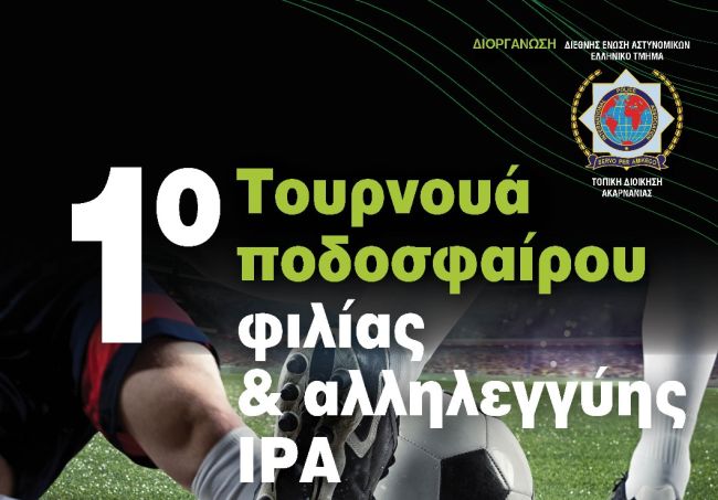 Η Τοπική Διοίκηση Ακαρνανίας της Διεθνούς Ένωσης Αστυνομικών διοργανώνει στις 29 και 30 Μαΐου ποδοσφαιρικό τουρνουά φιλίας και αλληλεγγύης για την υποστήριξη του συλλόγου γονέων παιδιών με νεοπλασματικές ασθένειες, «Η ΦΛΟΓΑ». Στο τουρνουά θα συμμετέχουν οι ποδοσφαιρικές ομάδες της Δ.Α Ακαρνανίας, Αχαΐας, Τρικάλων και Φωκίδας. Στις 29/05 και ώρα έξι θα πραγματοποιηθούν οι προκριματικοί αγώνες στα γήπεδα του Δοκιμίου και του Αγίου Κωνσταντίνου. Στο Δοκίμι θα αγωνιστούν η ομάδα της ΙΡΑ Αχαΐας με την ομάδα της ΙΡΑ Ακαρνανίας και στον Άγιο Κωνσταντίνο η ομάδα της ΙΡΑ Άμφισσας με αυτή της ΙΡΑ Τρικάλων.Στις 30/05 θα πραγματοποιηθούν ο μικρός και ο μεγάλος τελικός στο γήπεδο του Παναιτωλικού στις 16:00 και 18:30 αντίστοιχα.