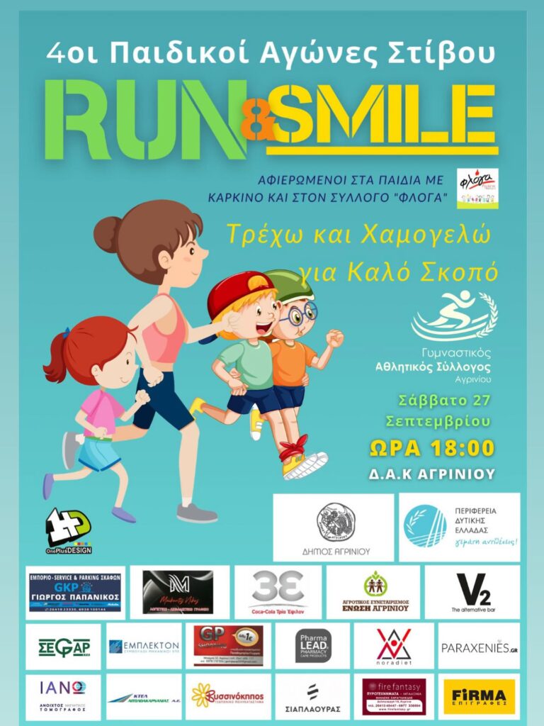 Ο Γυμναστικός Αθλητικός Σύλλογος Αγρινίου σε συνεργασία με την Περιφέρεια Δυτικής Ελλάδας και το Δήμο Αγρινίου διοργανώνει τους 4ους Παιδικούς Αγώνες Στίβου «Run and Smile» «Τρέχω για καλό σκοπό» το Σάββατο 27 Σεπτεμβρίου 2025 στο ΔΑΚ Αγρινίου «Μιχάλης Κούσης» και ώρα 18.00