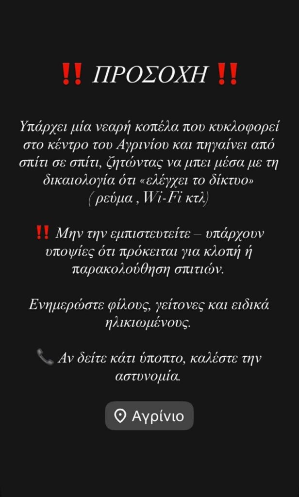 Aναστάτωση έχουν προκαλέσει στους κατοίκους του Αγρινίου αναρτήσεις στα μέσα κοινωνικής δικτύωσης, ότι νεαρή γυναίκα κυκλοφορεί στην πόλη και επιχειρεί να εισέλθει σε κατοικίες