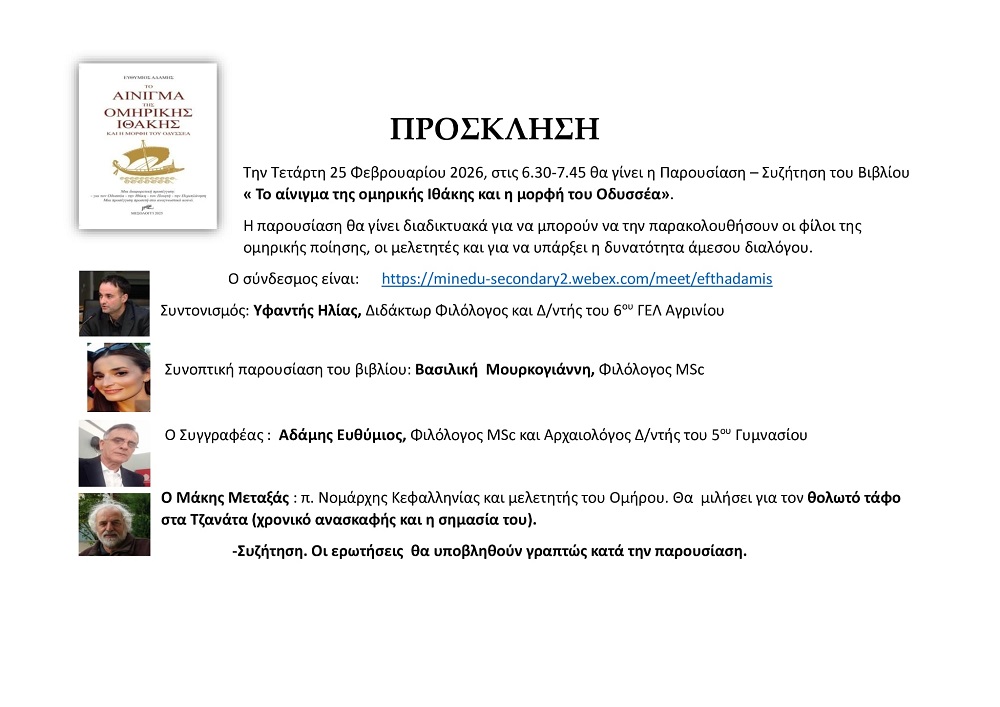 Την Τετάρτη 25 Φεβρουαρίου στις 6.30 μ.μ θα γίνει η παρουσίαση του βιβλίου «Το αίνιγμα της ομηρικής Ιθάκης και η μορφή του Οδυσσέα».