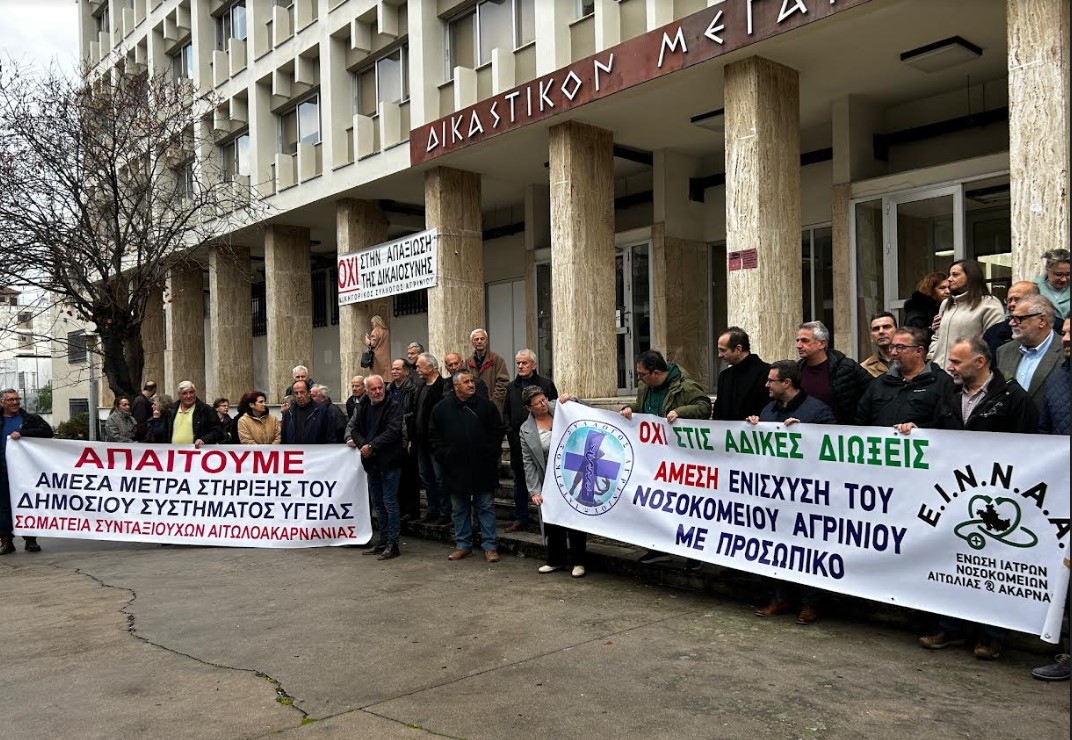 Η υπόθεση λόγω της αποχής των δικηγόρων πήρε αναβολή, όμως ο Ιατρικός Σύλλογος Αγρινίου είχε απευθύνει κάλεσμα σε παράσταση διαμαρτυρίας και για συμπαράσταση στους συναδέλφους  που κατηγορούνται άδικα. Στην κινητοποίηση συμμετείχαν υγειονομικοί καθώς και εκπρόσωποι συνταξιουχικών οργανώσεων και σωματείων.