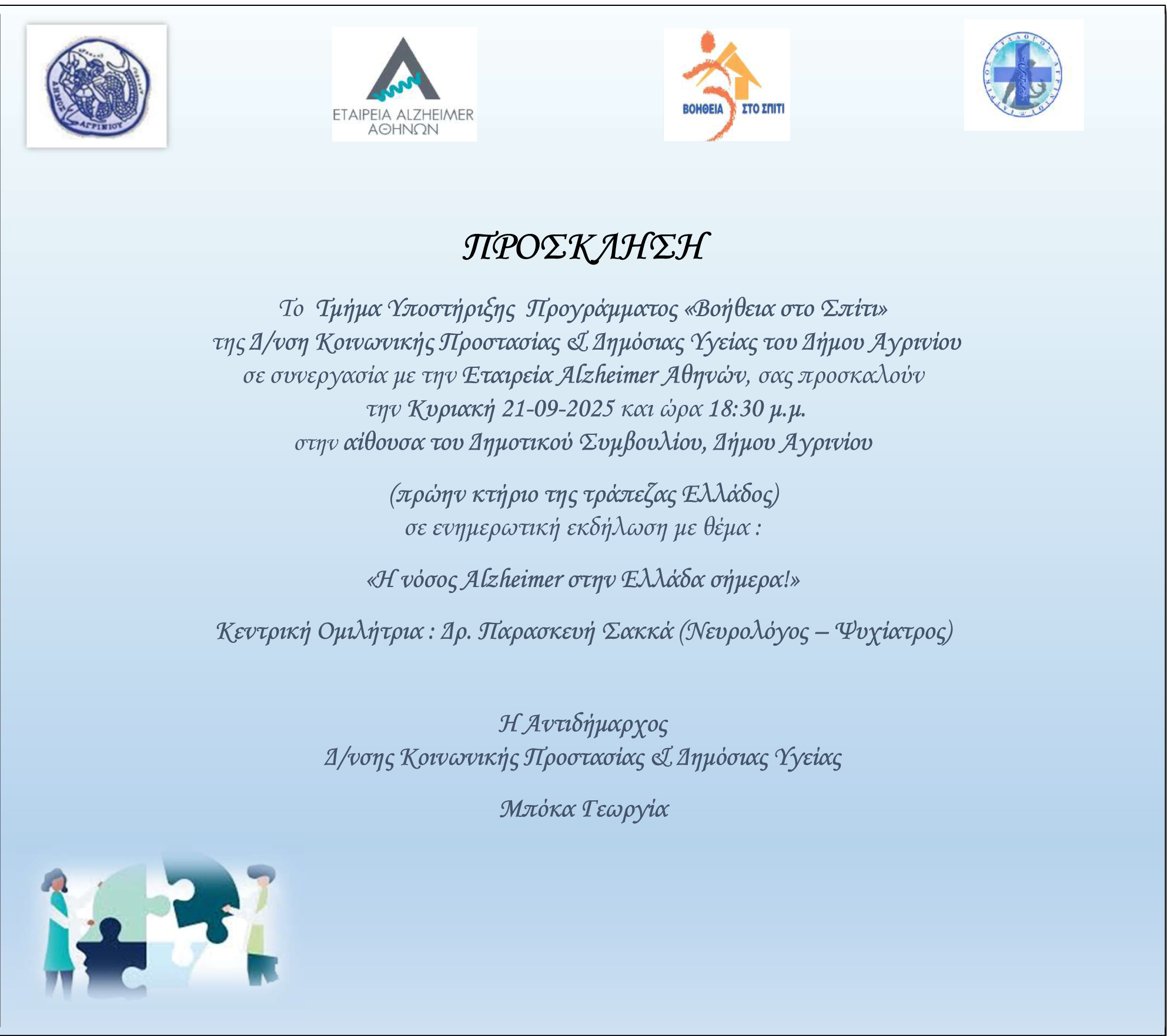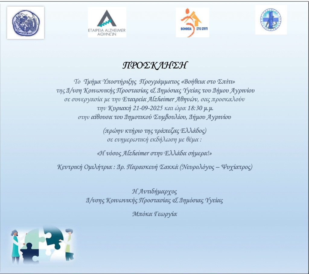 Το Τμήμα Υποστήριξης του Προγράμματος «Βοήθεια στο Σπίτι» της Διεύθυνσης Κοινωνικής Προστασίας και Δημόσιας Υγείας του Δήμου Αγρινίου, σε συνεργασία με την Εταιρεία Alzheimer Αθηνών, διοργανώνει ενημερωτική εκδήλωση με θέμα: «Η νόσος Alzheimer στην Ελλάδα σήμερα».