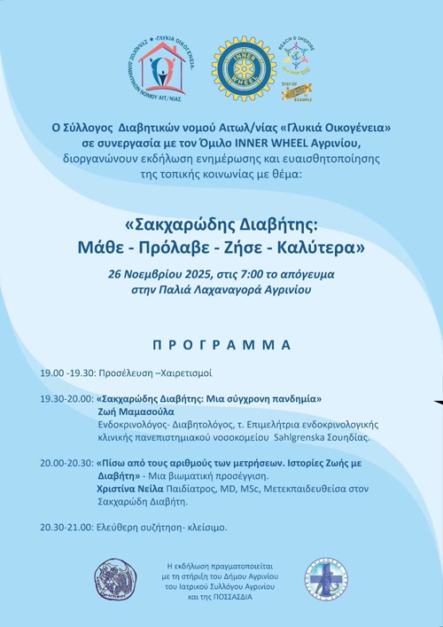 Ο Σύλλογος Διαβητικών Νομού Αιτωλοακαρνανίας “Γλυκιά Οικογένεια”, σε συνεργασία με τον Όμιλο INNER WHEEL Αγρινίου, διοργανώνουν εκδήλωση ενημέρωσης και ευαισθητοποίησης της τοπικής κοινωνίας με θέμα: