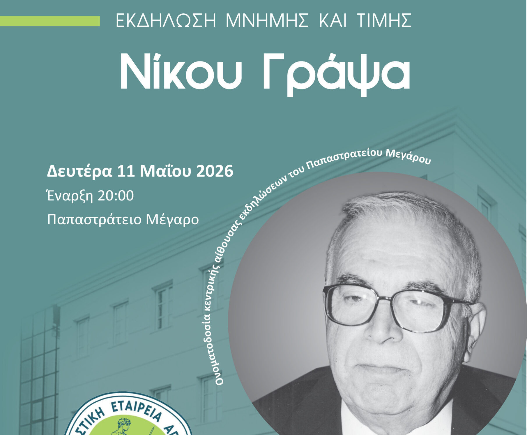 Η Γυμναστική Εταιρεία Αγρινίου (Γ.Ε.Α.) διοργανώνει τη Δευτέρα 11 Μαΐου 2026 και ώρα 20:00, στο Παπαστράτειο Μέγαρο, εκδήλωση μνήμης και τιμής για τον αείμνηστο Πρόεδρό της, Νίκο Γράψα.