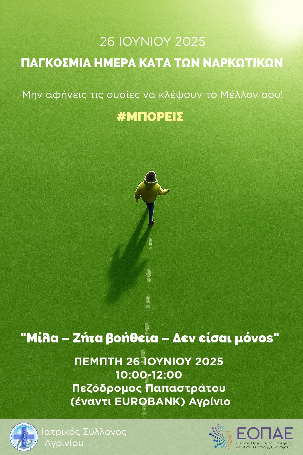 σας προσκαλεί να συμμετάσχετε στη δράση ενημέρωσης και ευαισθητοποίησης κατά των ναρκωτικών, που θα πραγματοποιηθεί σε συνεργασία με τον ΕΟΠΑΕ και τη ΜΟΘΕ Αγρινίου του ΕΟΠΑΕ την Πέμπτη 26 Μαΐου 2025, από 10:00 έως 12:00, στον πεζόδρομο της Παπαστράτου (στο ύψος της EUROBANK).