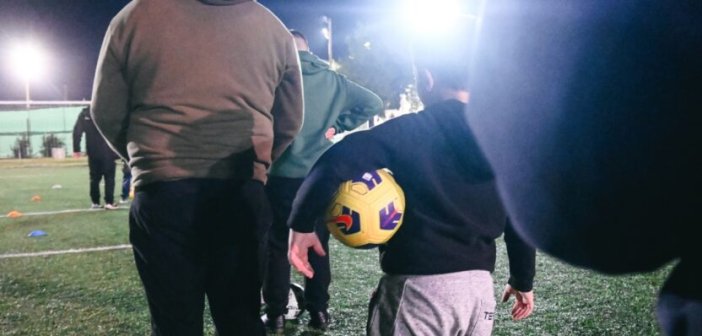 Αυτοί οι δύο είναι από τους μεγαλύτερους του τμήματος και εκείνοι που βοηθούν τα υπόλοιπα παιδιά να κάνουν τα πρώτα τους βήματα στο άθλημα. Η προπόνηση είναι ουσιαστικά χωρισμένη σε δύο μέρη. Το πρώτο αφορά την προθέρμανση. Τα μέλη της ομάδας πηδούν εμπόδια και τρέχουν ανάμεσα στα κονάκια για να ζεσταθούν. Ύστερα στήνονται στη σειρά και ένα ένα εκτελεί σουτ στον Παναγιώτη που βρίσκεται στο τέρμα.