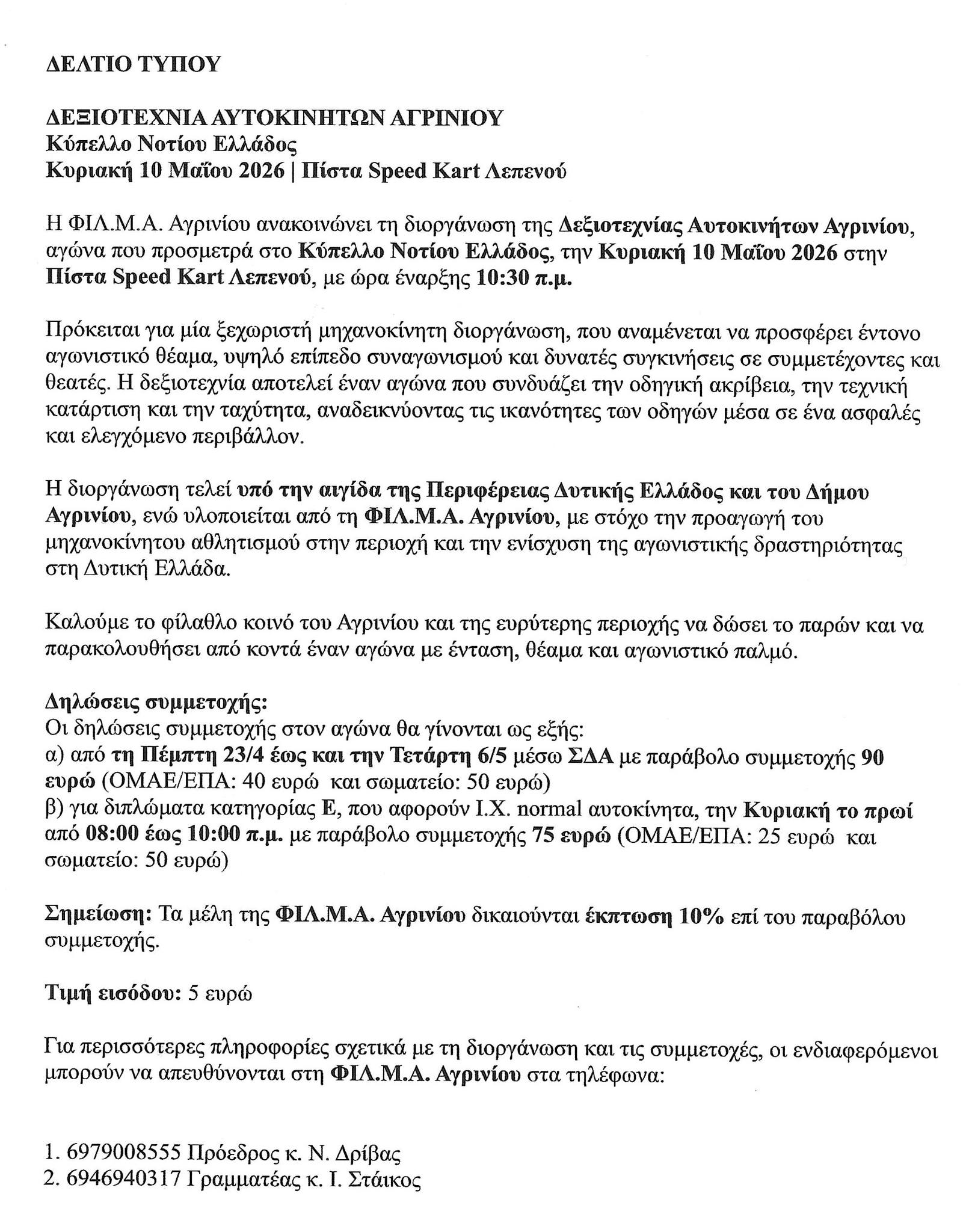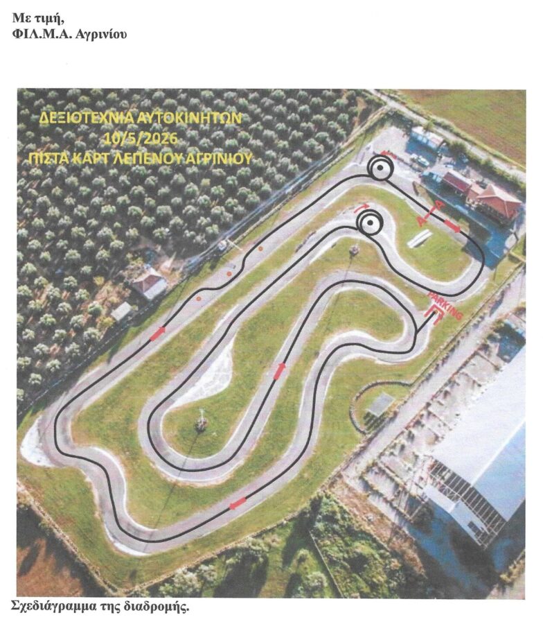 Μια ξεχωριστή μηχανοκίνητη διοργάνωση ετοιμάζεται να φιλοξενήσει η περιοχή του Αγρινίου, καθώς την Κυριακή 10 Μαΐου 2026 θα πραγματοποιηθεί η Δεξιοτεχνία Αυτοκινήτων Αγρινίου, αγώνας που προσμετρά στο Κύπελλο Νοτίου Ελλάδος.