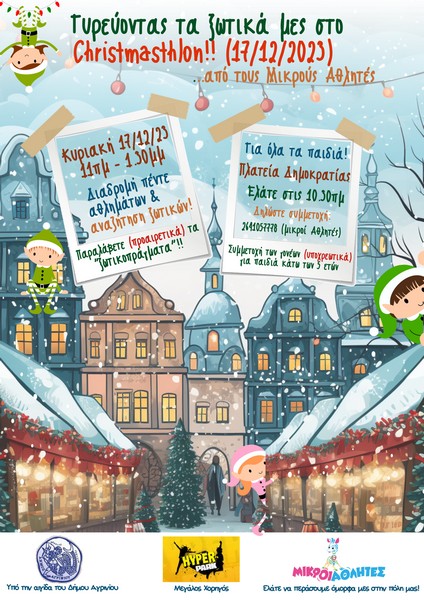 Μια αθλητική πρωτότυπη δράση υπό την αιγίδα του Δήμου Αγρινίου που δεν πρέπει να χάσουν οι μικροί μας φίλοι μες στις γιορτές!! Οι Μικροί Αθλητές διοργανώνουν δωρεάν μια Χριστουγεννιάτικη Αθλητική διαδρομή κατά μήκος της οδού Παπαστράτου η οποία θα μετατραπεί σε “Οδό” Αθλημάτων. Θα γνωρίσουμε πέντε διαφορετικά αθλήματα διασχίζοντας την, ώσπου να φτάσουμε στην κεντρική πλατεία. Έπειτα, θα παίξουμε κινητικά, παιδαγωγικά, εικαστικά και δραματοποιημένα παιχνίδια σε ομάδες με στόχο να “ταξιδέψουμε” σε διάφορες χώρες των Χριστουγέννων! Και που ξέρετε;; Ίσως να βρούμε και τα ξωτικά τους μέσα στον τεράστιο λαβύρινθο!! Η δράση αφορά όλες τις ηλικίες παιδιών. Σημείο συνάντησης: 10.30 Πλατεία Δημοκρατίας.