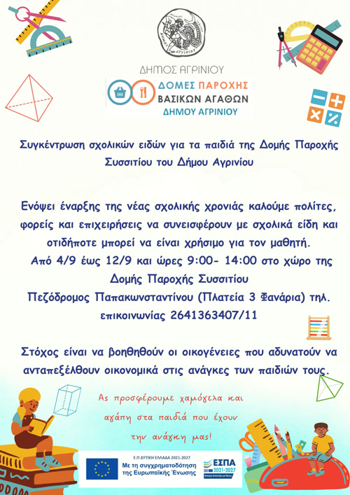 Η συγκέντρωση σχολικών ειδών θα πραγματοποιείται από Πέμπτη 4 Σεπτεμβρίου  έως  και την Παρασκευή 12 Σεπτεμβρίου 2025, από τις 9:00 – 14:00 στον χώρο της Δομής Παροχής Συσσιτίου Πεζόδρομος Παπακωνσταντίνου (Πλατεία 3 Φανάρια στο Αγρίνιο).