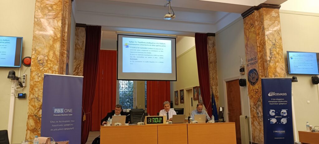 Με επιτυχία πραγματοποιήθηκε στο Αγρίνιο στις 3 Νοεμβρίου 2023, στην αίθουσα του Δημοτικού Συμβουλίου του Δήμου Αγρινίου, ημερίδα με θέμα: “ΦΠΑ στο Ηλεκτρονική Εμπόριο & Ηλεκτρονική Τιμολόγηση B2G”