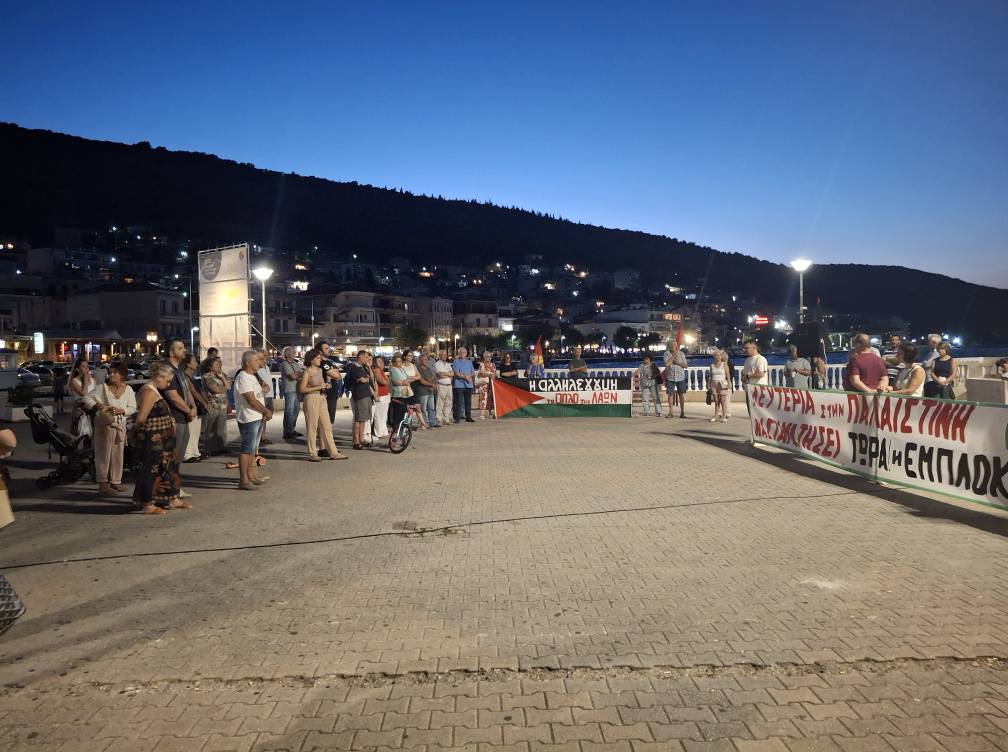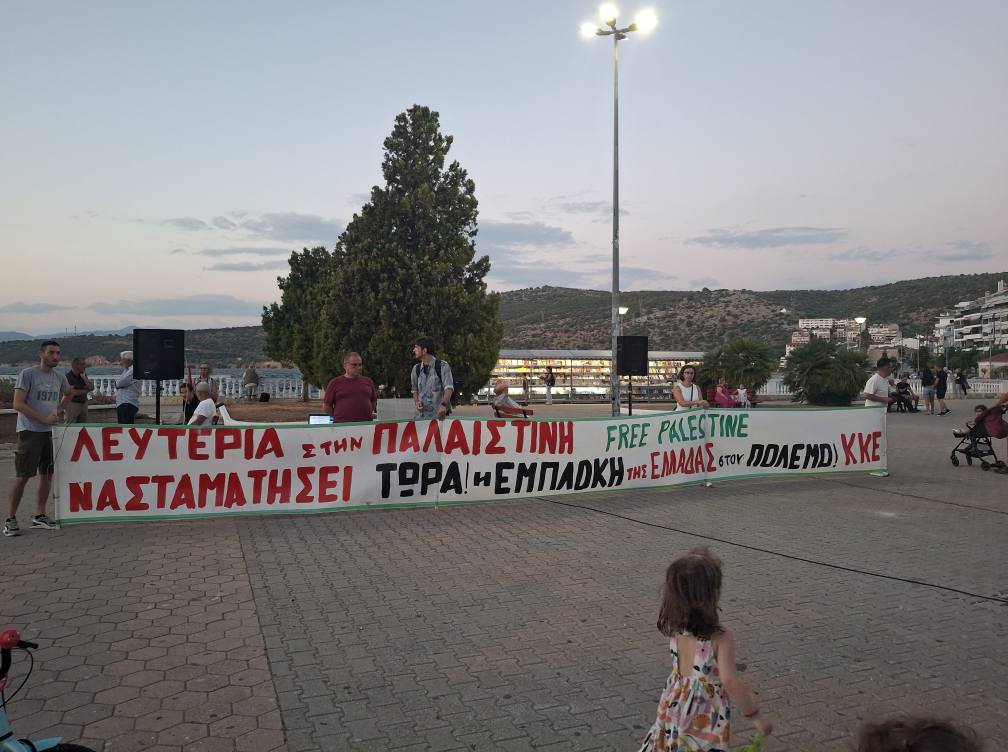 Παράλληλα, οι συγκεντρωμένοι απαίτησαν καμιά συνεργασία, πολιτική, οικονομική, στρατιωτική ή άλλη της Ελλάδας με το Ισραήλ, να μην έχει καμιά εμπλοκή η χώρα μας στα σφαγεία του ιμπεριαλιστικού πολέμου όπου γης.