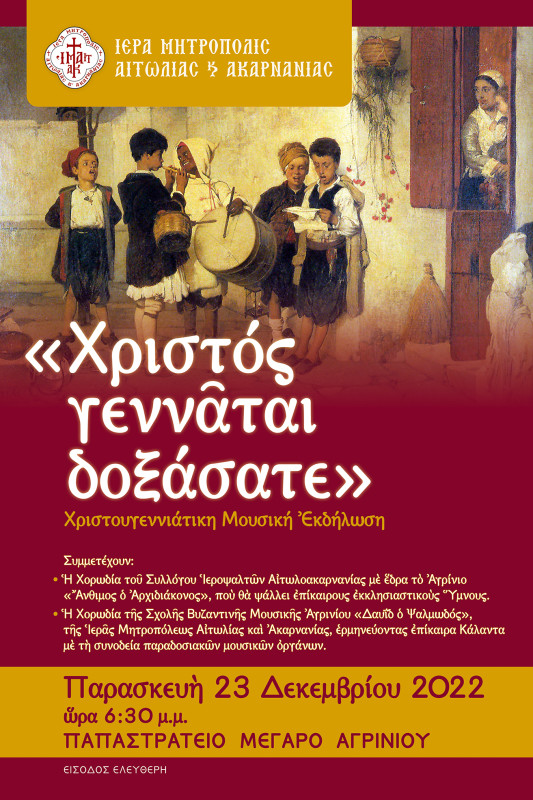 Η Ιερά Μητρόπολις Αιτωλίας και Ακαρνανίας ανακοινώνει την διοργάνωση Μουσικής Εκδήλωσης με την ευκαιρία της μεγάλης Εορτής των Χριστουγέννων και του Αγίου Δωδεκαημέρου.