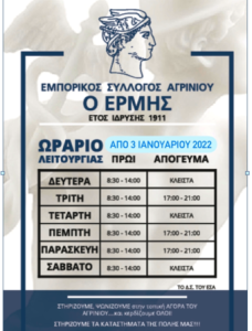 Το ωράριο λειτουργίας των εμπορικών καταστημάτων του Αγρινίου, από 3 Ιανουαρίου 2022.