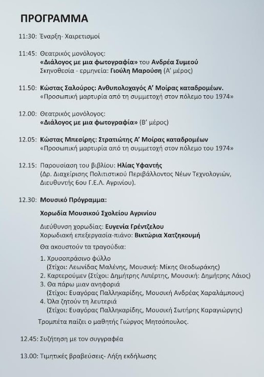 Ο Δήμος Αγρινίου σας προσκαλεί στην παρουσίαση του βιβλίου του Ρένου Χριστοδουλίδη «Πολεμώντας στην Κύπρο το 1974- Μνήμες Αιτωλοακαρνάνων καταδρομέων».
