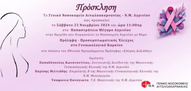 Το Νοσοκομείο Αγρινίου προσκαλεί τους πολίτες σε ημερίδα με θέμα «πρόληψη – προσυμπτωματικός έλεγχος στο γυναικολογικό καρκίνο» που θα λάβει χώρα στο πλαίσιο του Εθνικού Προγράμματος Πρόληψης «Σπύρος Δοξιάδης».