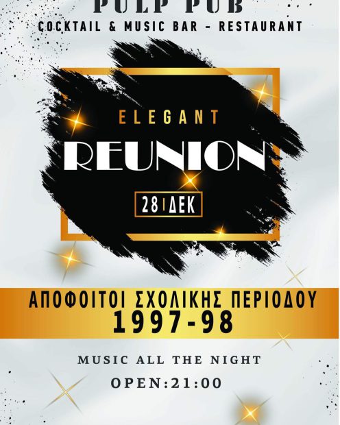 Εορταστικό reunion διοργανώνουν οι απόφοιτοι της σχολικής περιόδου 1997-1998 στο Αγρίνιο, την Τετάρτη 28 Δεκεμβρίου 2022. Το reunion θα πραγματοποιηθεί στο Pulp Pub (Cocktail & Music Bar – Restaurant), οδός Ζέρβα 11, Αγρίνιο. Οι πόρτες ανοίγουν στις 9 το βράδυ. Ελάτε με κέφι, για να θυμηθούμε τα παλιά και να… γιορτάσουμε τα νέα που έρχονται με το καινούργιο έτος, με ολονύχτια μουσική, φαγητό, ποτό και χορό.
