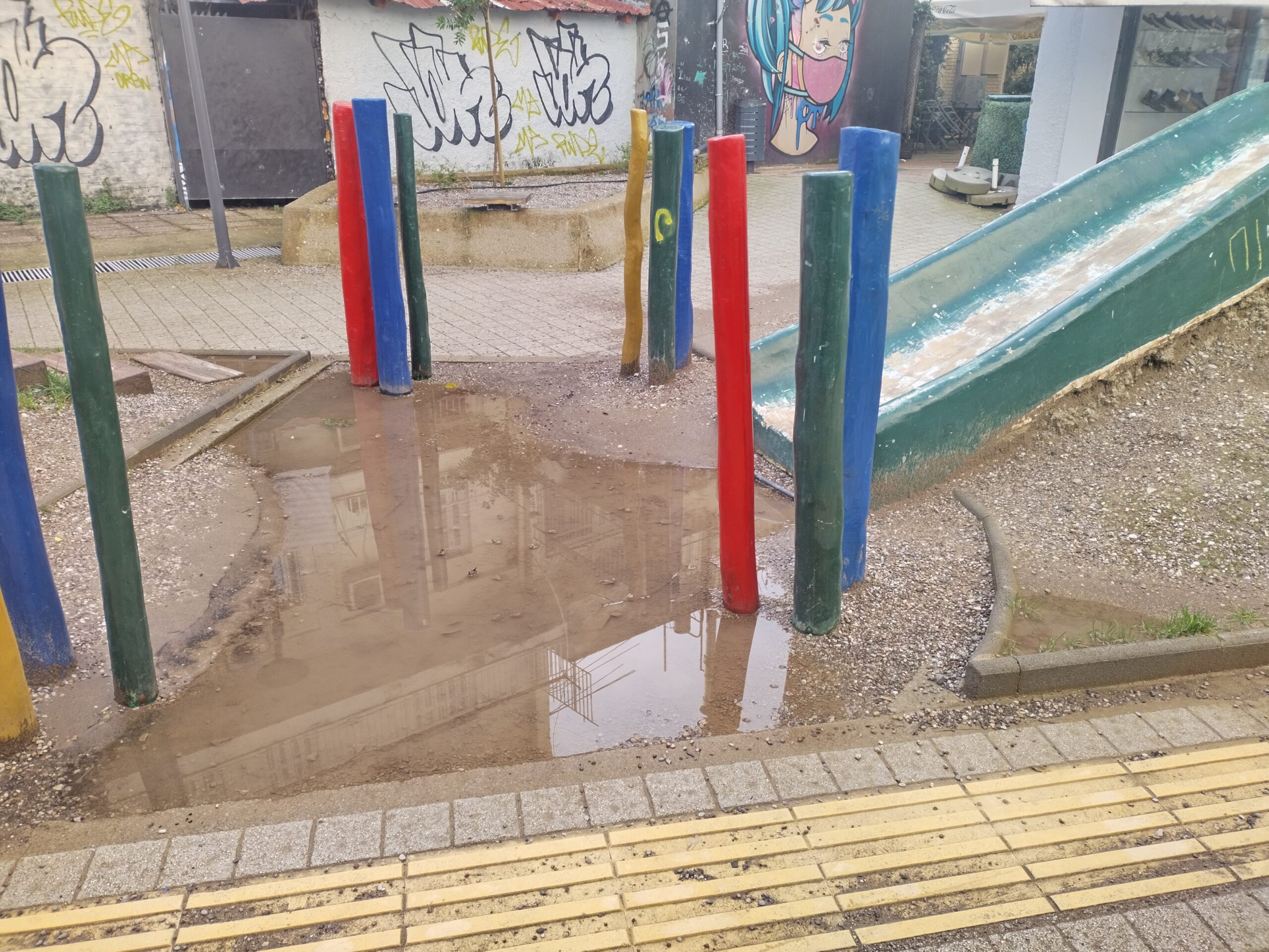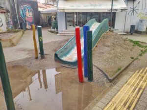Μόλις τον περασμένο Μάρτιο είχε παραδοθεί πλήρως ανακαινισμένη η ανώνυμη πλατεία παραπλεύρως της πλατείας Δημοκρατίας στο Αγρίνιο, μεταξύ των οδών Μπαϊμπά και Δ. Σταΐκου, μετά τη ριζική ανάπλασή της. Η εικόνα της όμως είναι κακή αυτή την εποχή τόσο γιατί λιμνάζουν νερά στο σημείο, όσο και γιατί υπάρχουν σημαντικές φθορές στα παιχνίδια και τα όργανα.