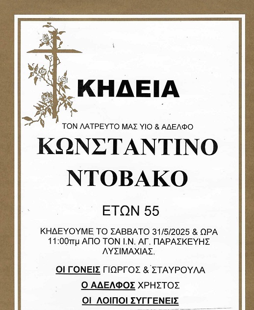 Ο 55χονος Κώστας Ντοβακος έφυγε από την ζωή σκορπίζοντας θλίψη στο Αγρίνιο αλλά και την Λυσιμαχία όπου συγγενείς και φίλοι θα τον συνοδεύσουν στην τελευταία του κατοικία.