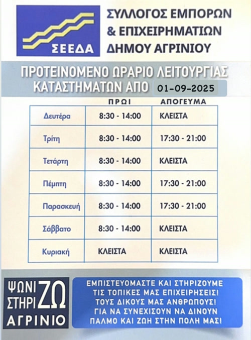 Ο Σύλλογος Εμπόρων και Επιχειρηματιών Δήμου Αγρινίου υπενθυμίζει και ενημερώνει τους καταναλωτές για το ωράριο λειτουργίας των Εμπορικών καταστημάτων στην Πόλη του Αγρινίου από 01/09/2025 :