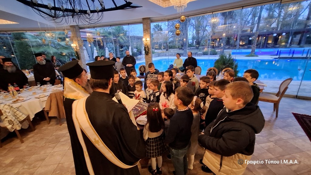 Ο Σεβασμιώτατος τους υποδέχθηκε όλους με πολλή χαρά και αντάλλαξε εορταστικές ευχές. Μετά την ευλογία της βασιλόπιτας προσέφερε δώρα σε όλα τα παιδιά, τα οποία εξέφρασαν τη χαρά και τον ενθουσιασμό τους και ευχαρίστησαν τον Ποιμενάρχη τους. Κατόπιν τα μικρά παιδιά απασχολήθηκαν με δημιουργικό τρόπο, συμμετέχοντας σε χριστουγεννιάτικες δράσεις και παιχνίδια.