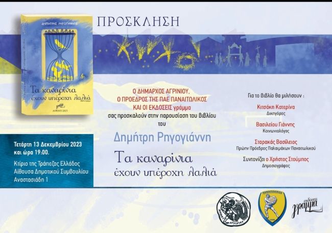 Ο Δήμαρχος Αγρινίου, ο Πρόεδρος της ΠΑΕ Παναιτωλικός και οι Εκδόσεις Γράμμα συνδιοργανώνουν την σας παρουσίαση του βιβλίου του Δημήτρη Ρηγογιάννη με τίτλο: